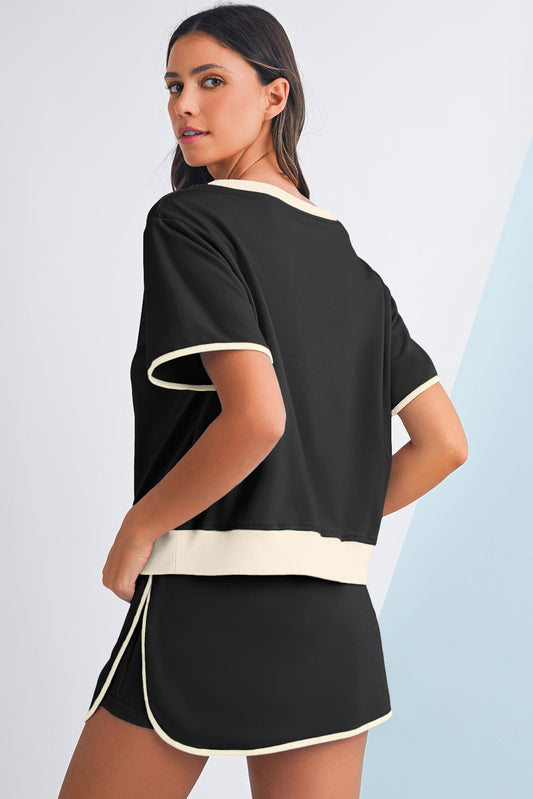 Black Colorblock Edge Drop Shoulder T Shirt and Skort 2Pcs Set