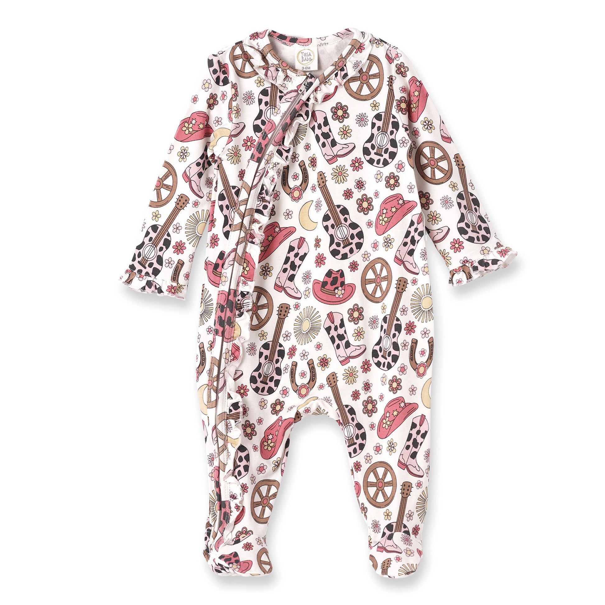 Saddle up for snuggles in our ultra-soft, Western-inspired zipper romper! Crafted from a cozy blend of bamboo, cotton, and spandex, this outfit is decked out with delightful cowgirl motifs. Designed with busy little wranglers in mind, it features a handy two-way zipper for quick changes and a comfy neck guard to protect delicate skin. Hypoallergenic and eco-friendly, this romper is just right for your little cowpoke. Toss it in warm water and tumble dry low to keep your tiny trailblazer comfy and cute on every adventure! 🤠