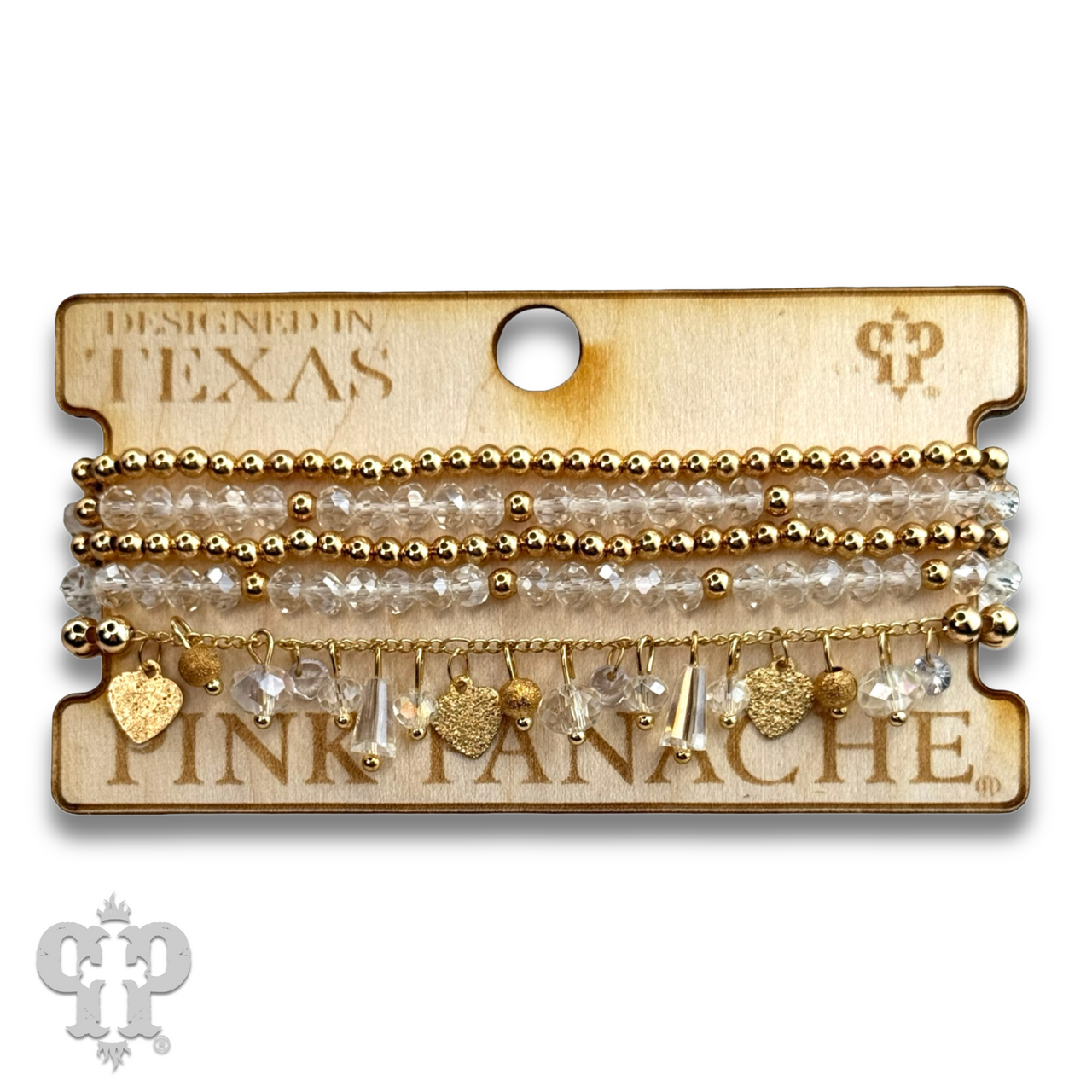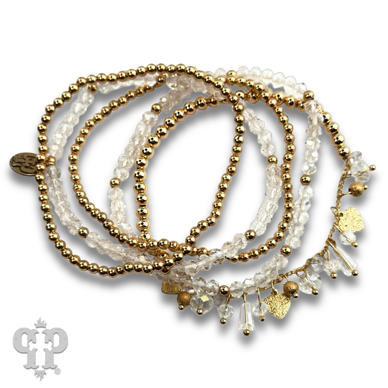 This bracelet set has five strands of clear and metal tone beads. One of the strands has a section of chain with mixed tiny bead and heart charms.