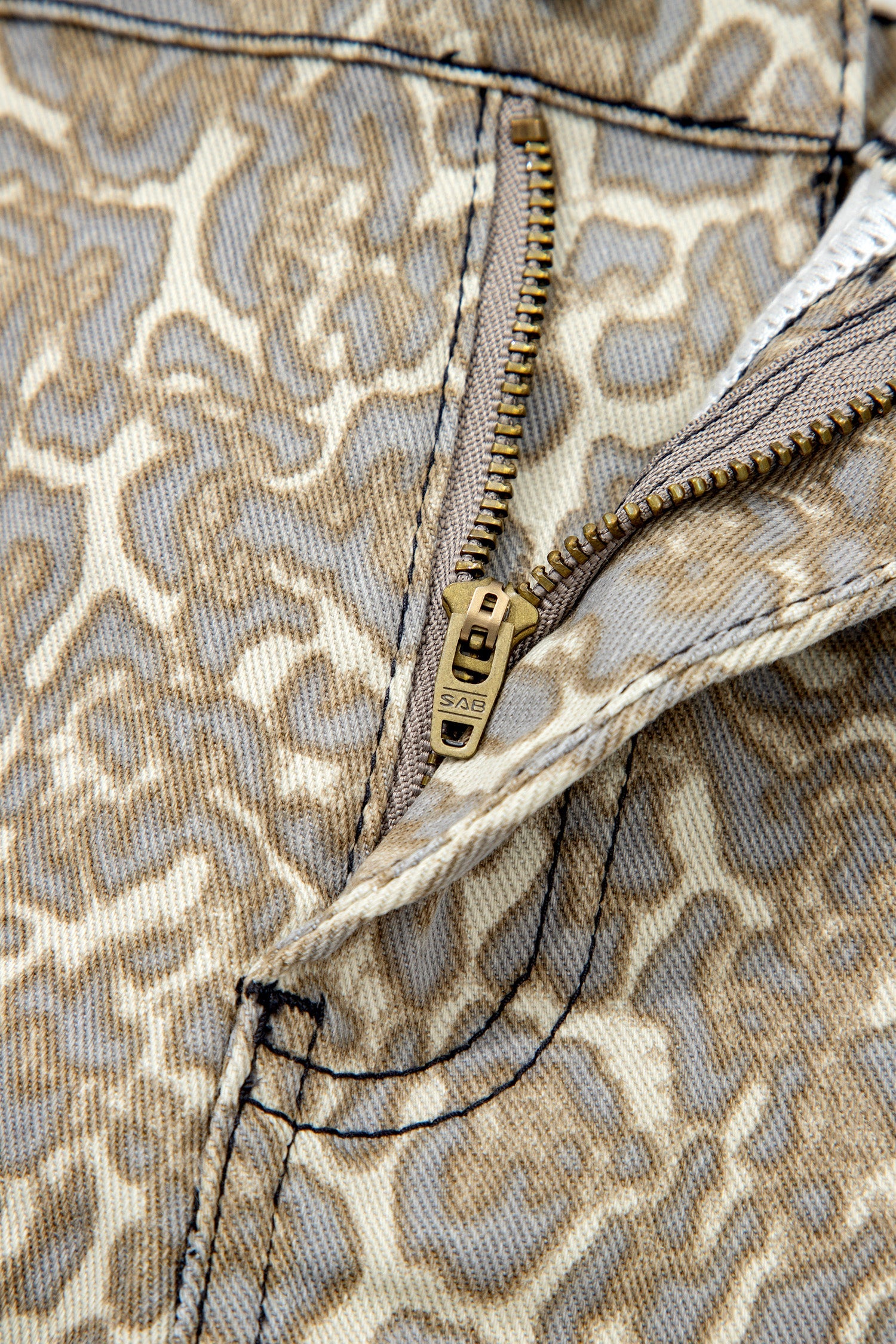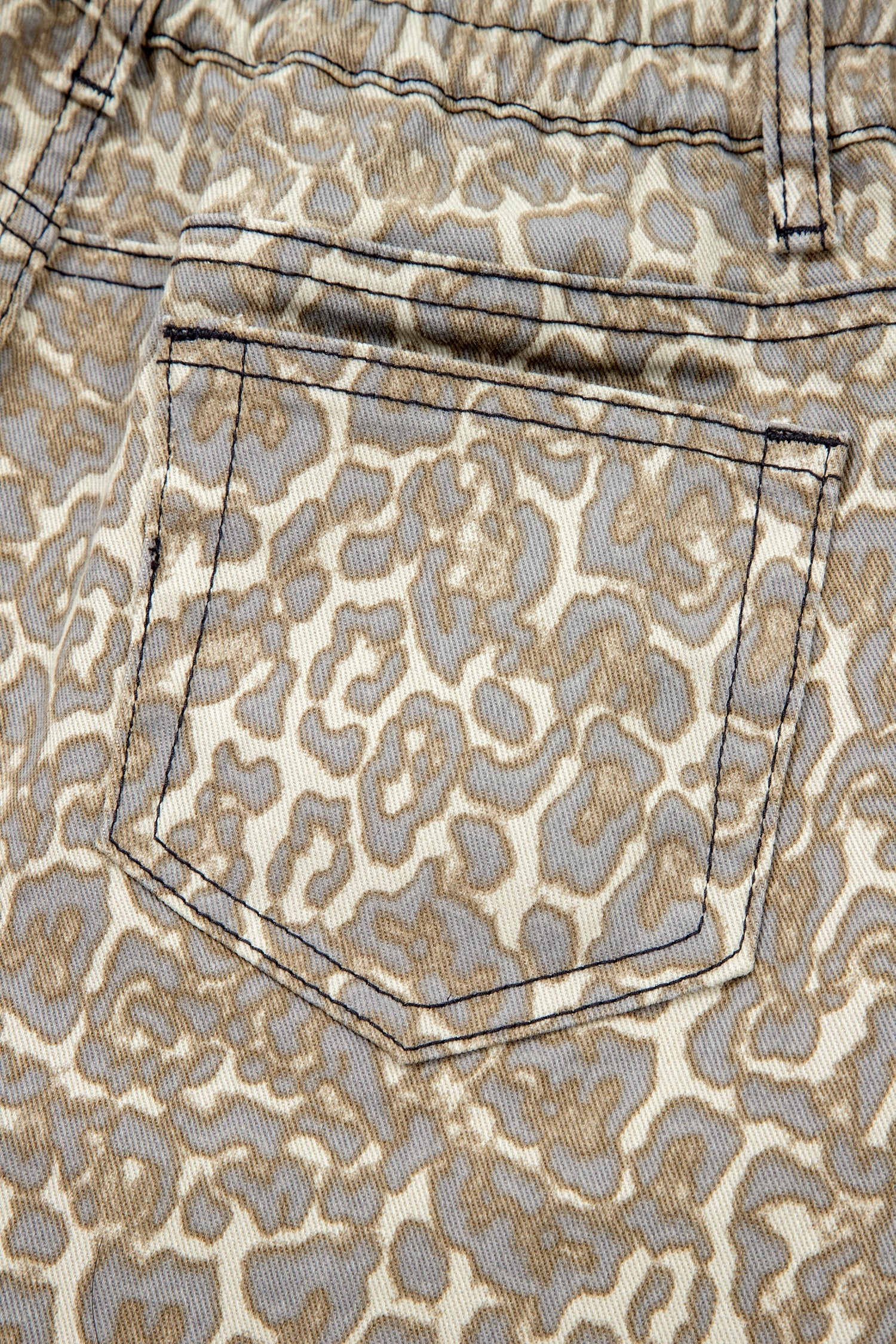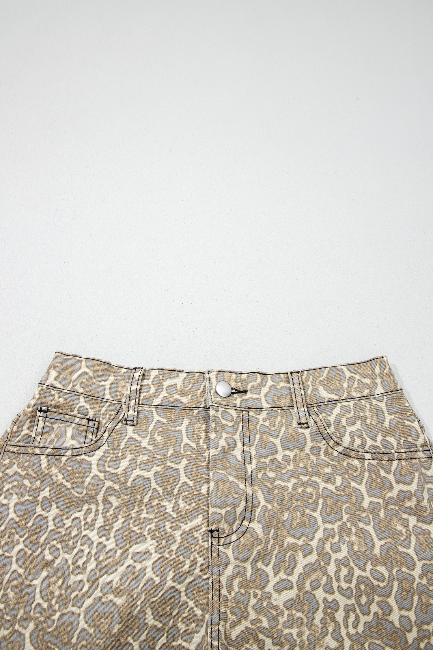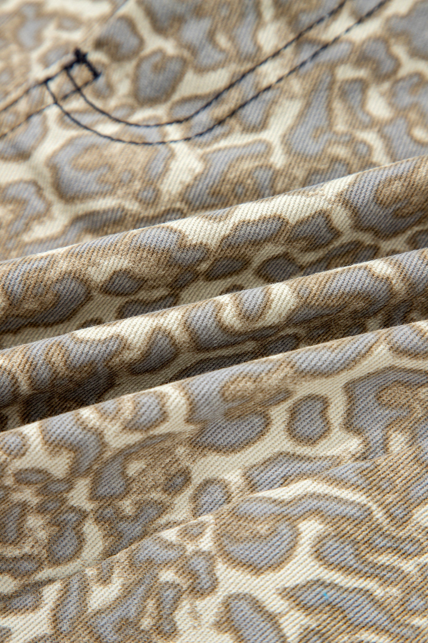 Leopard print denim shorts feature raw edge hems for bold, edgy style.