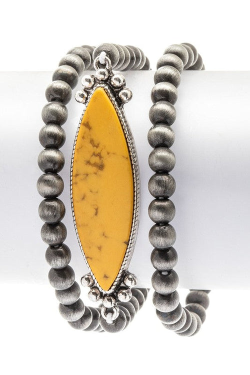 Hand-strung stretch bracelet set combining Navajo pearl-style beads with a striking marquise turquoise stone centerpiece — designed for easy, comfortable wear and instant southwest-inspired style. Lightweight and flexible, it layers like a cuff while fitting snugly on most wrists for everyday wear or stacked looks.