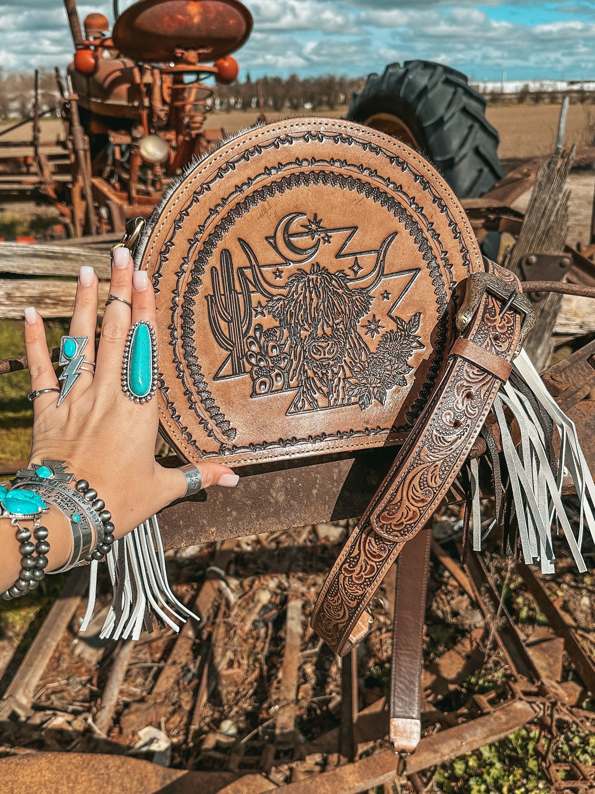 Introducing The Bucking Canteen, a Haute Southern Hyde by Beth Marie Exclusive! Made for the Wild Wild Western gal! She features tons of space and one cubby slot. And a little added touch of removeable fringe tassels on the side. The rear allows one 6.5" x 5.5" zipper pocket. Keep em, or remove them and gift them as keychain charms :) She features and adjustable western belt buckle strap.