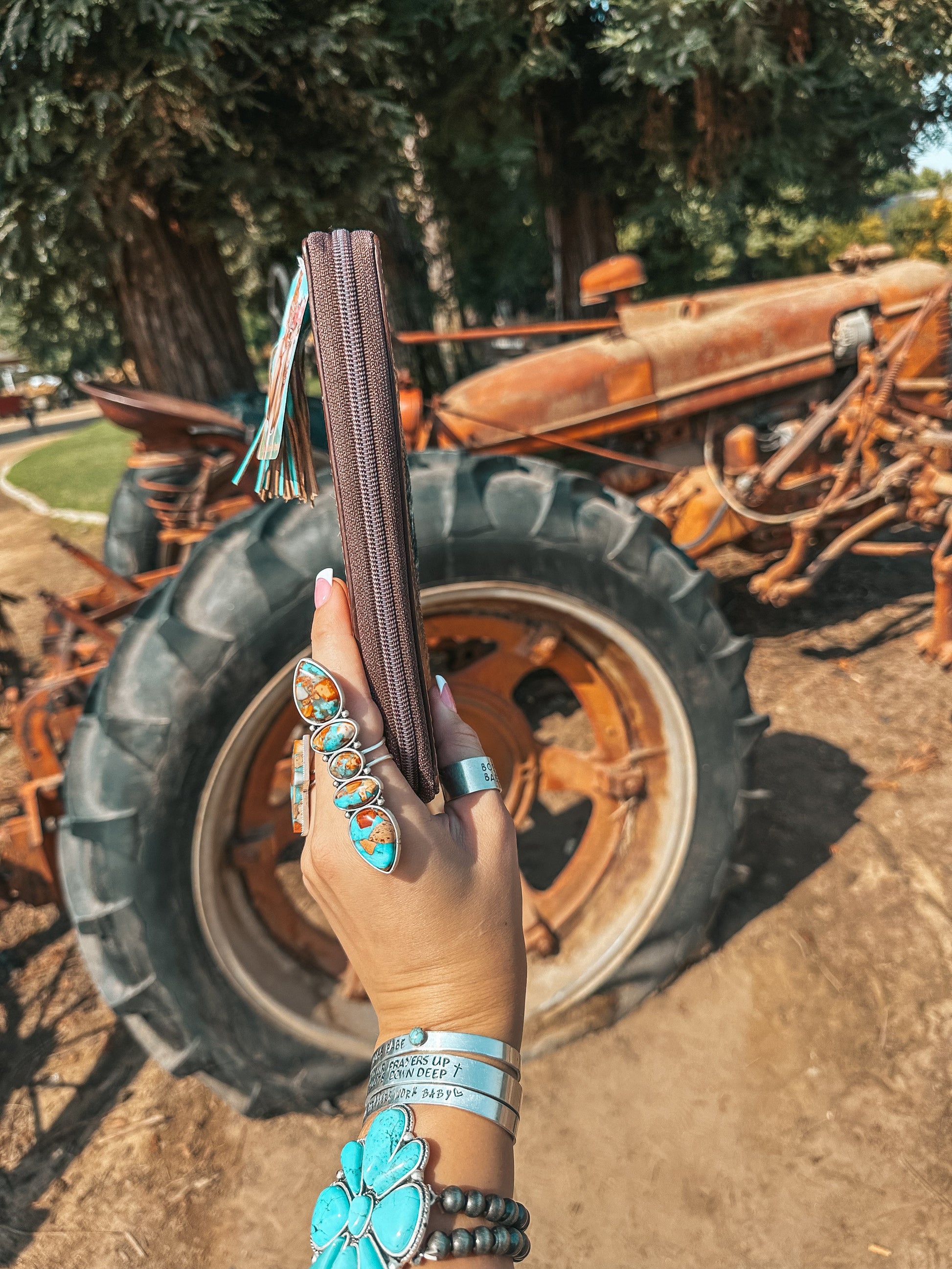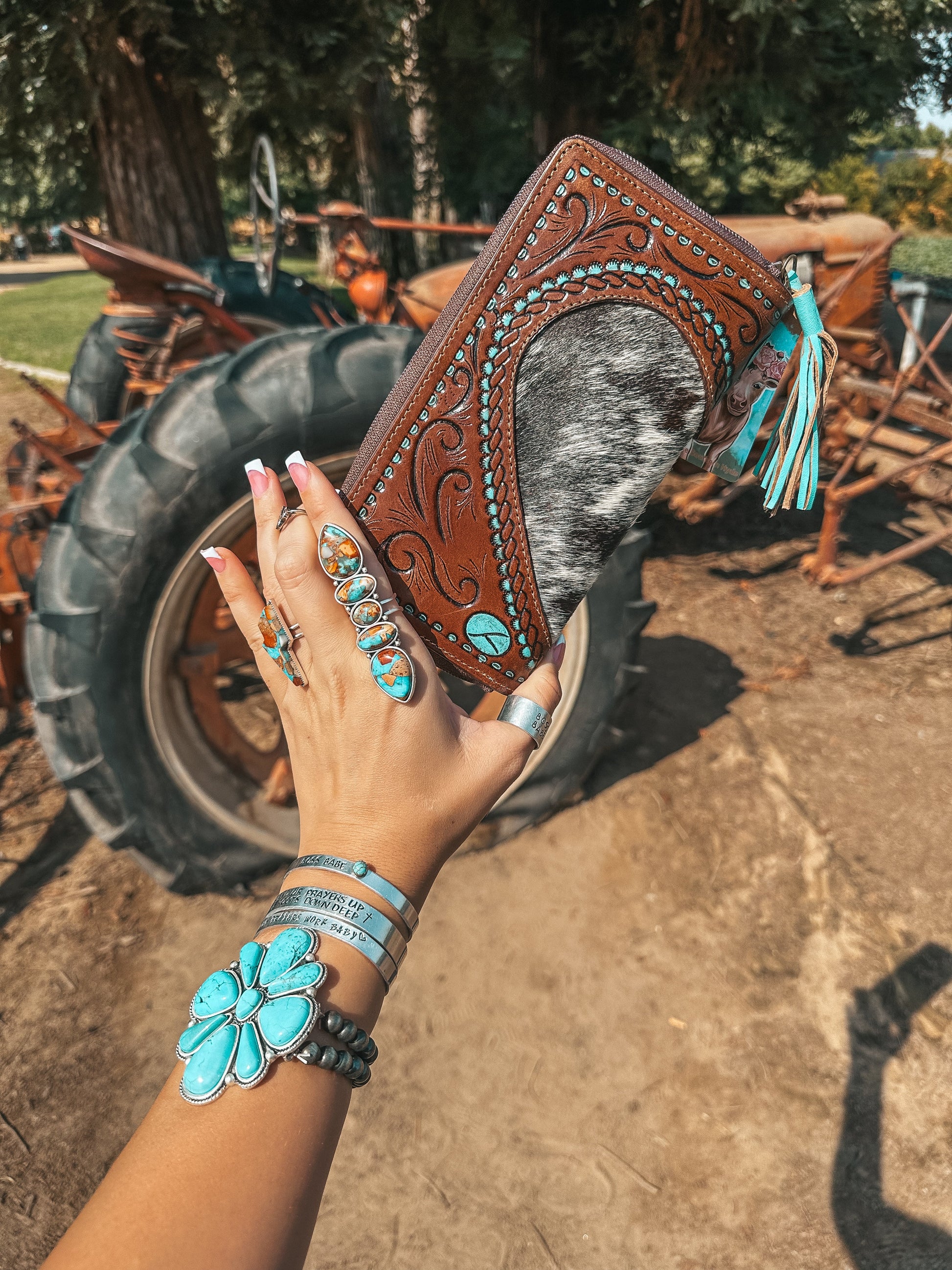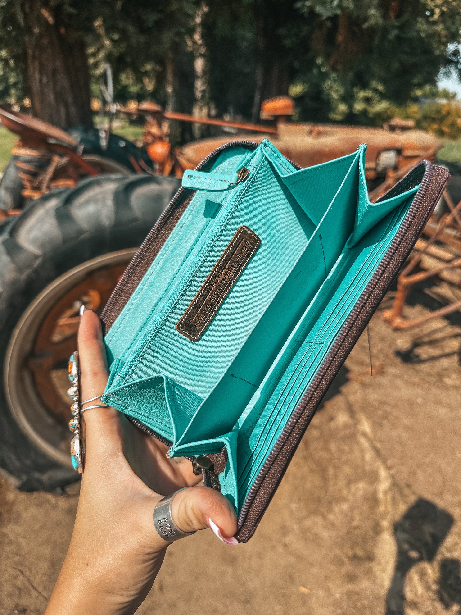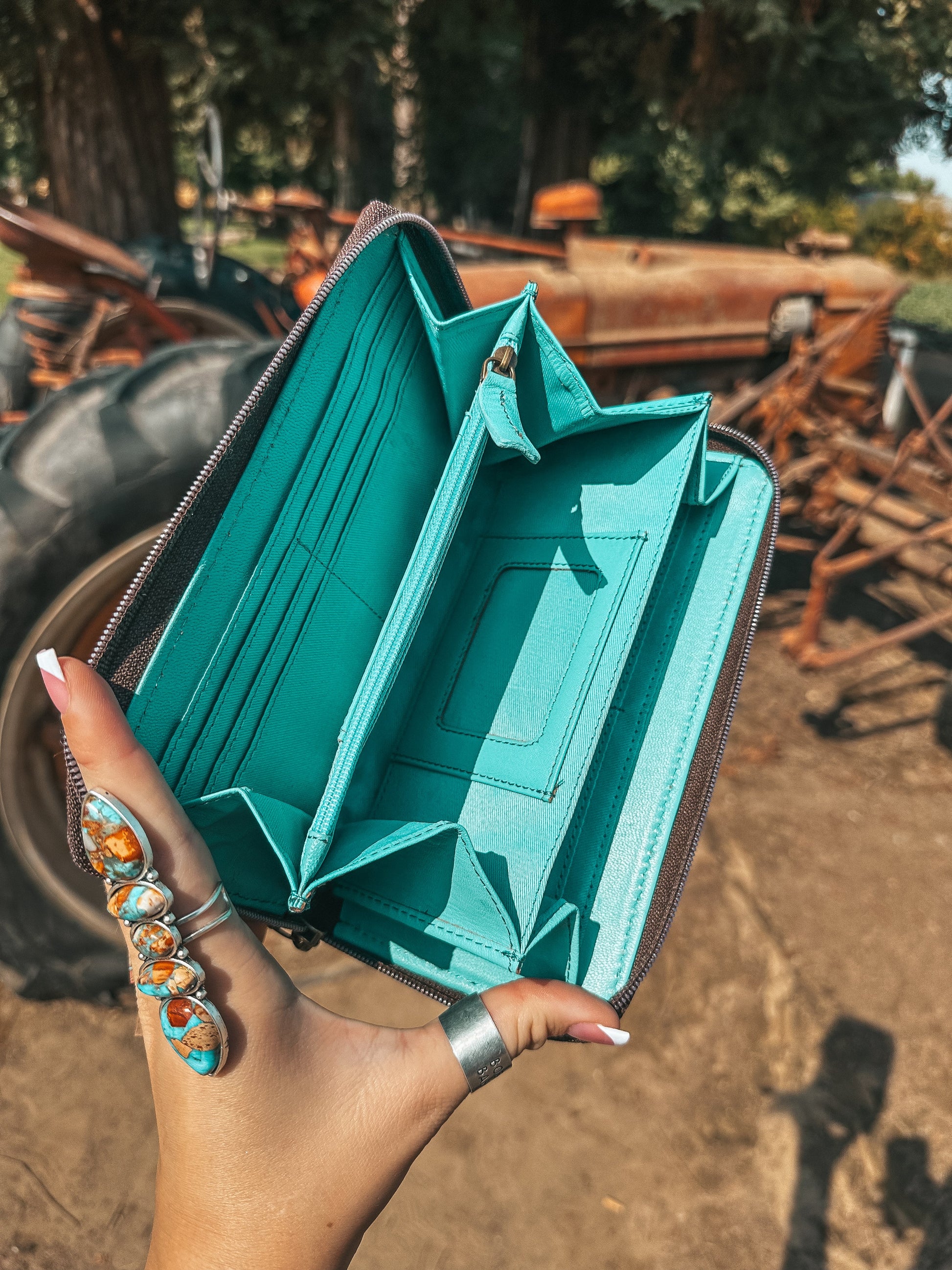 The interior boasts 13 card holder slots with one of them being for your ID card. Don’t go without your change holder either, we got one centrally located for you. When you’re done, zip her up and keep all your valuables safe. Please note each well it will be made with a one of a kind cowhide piece.