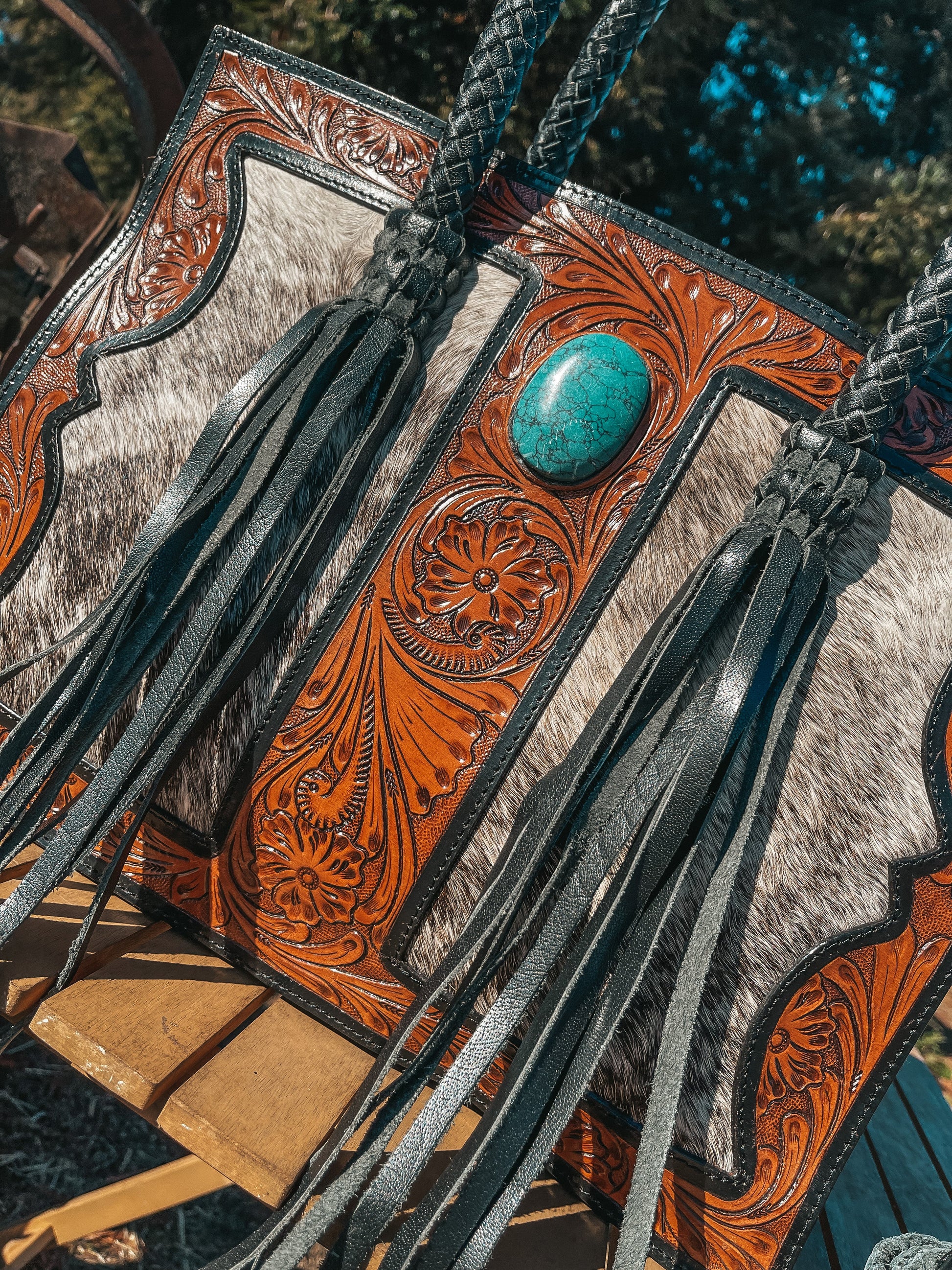 Please note each purse will be one of a kind and will be made with a brand new unique cowhide piece and faux turquoise stone.