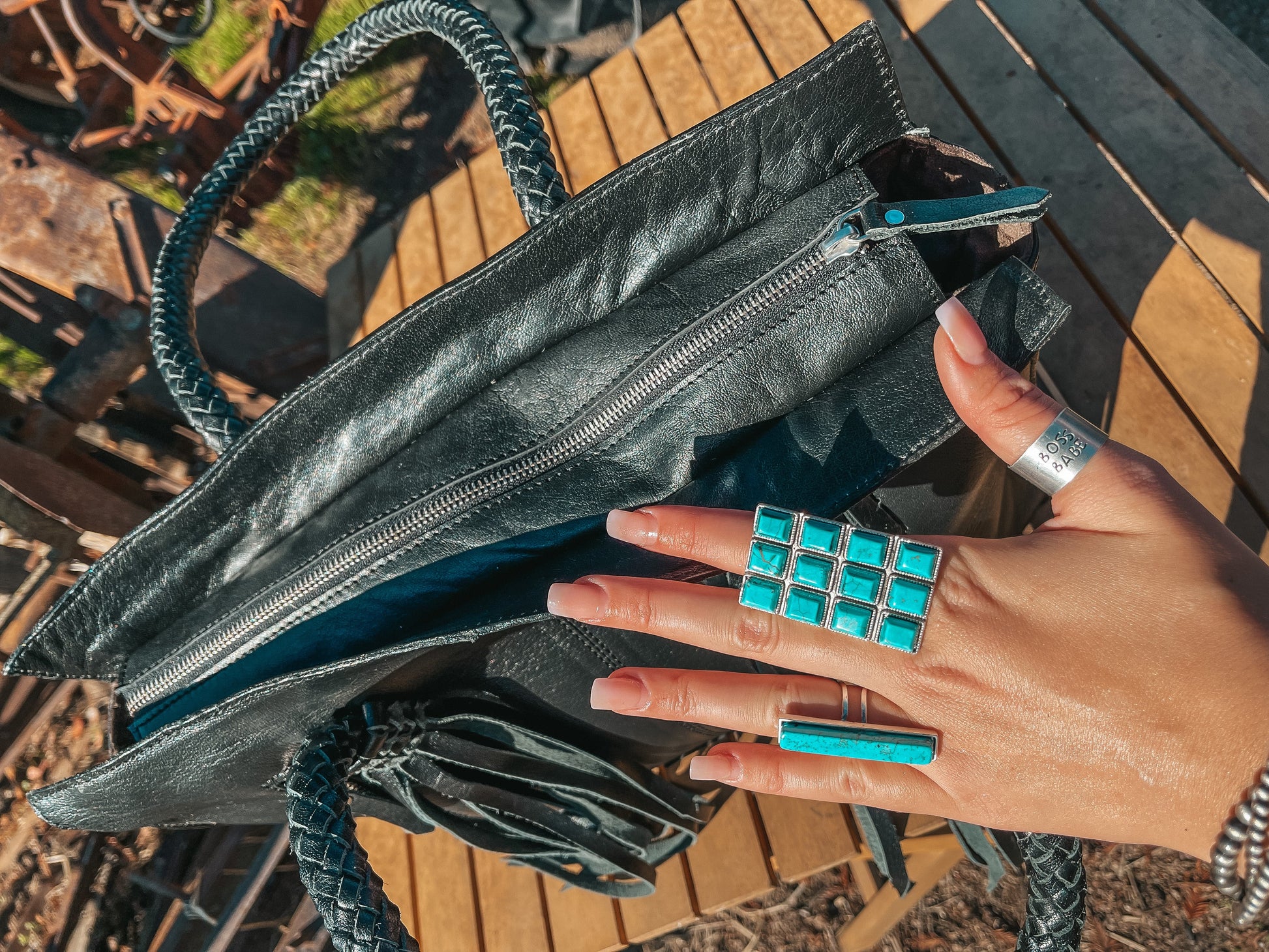 The interior boasts a luxurious brown velvet with two cubby pockets and one zipper pocket. She also comes with a hand braided removable shoulder strap. Two Concealed carry zippers accessing one pocket in the rear boast tons of storage space for your piece accessible for a right or left handed carry.