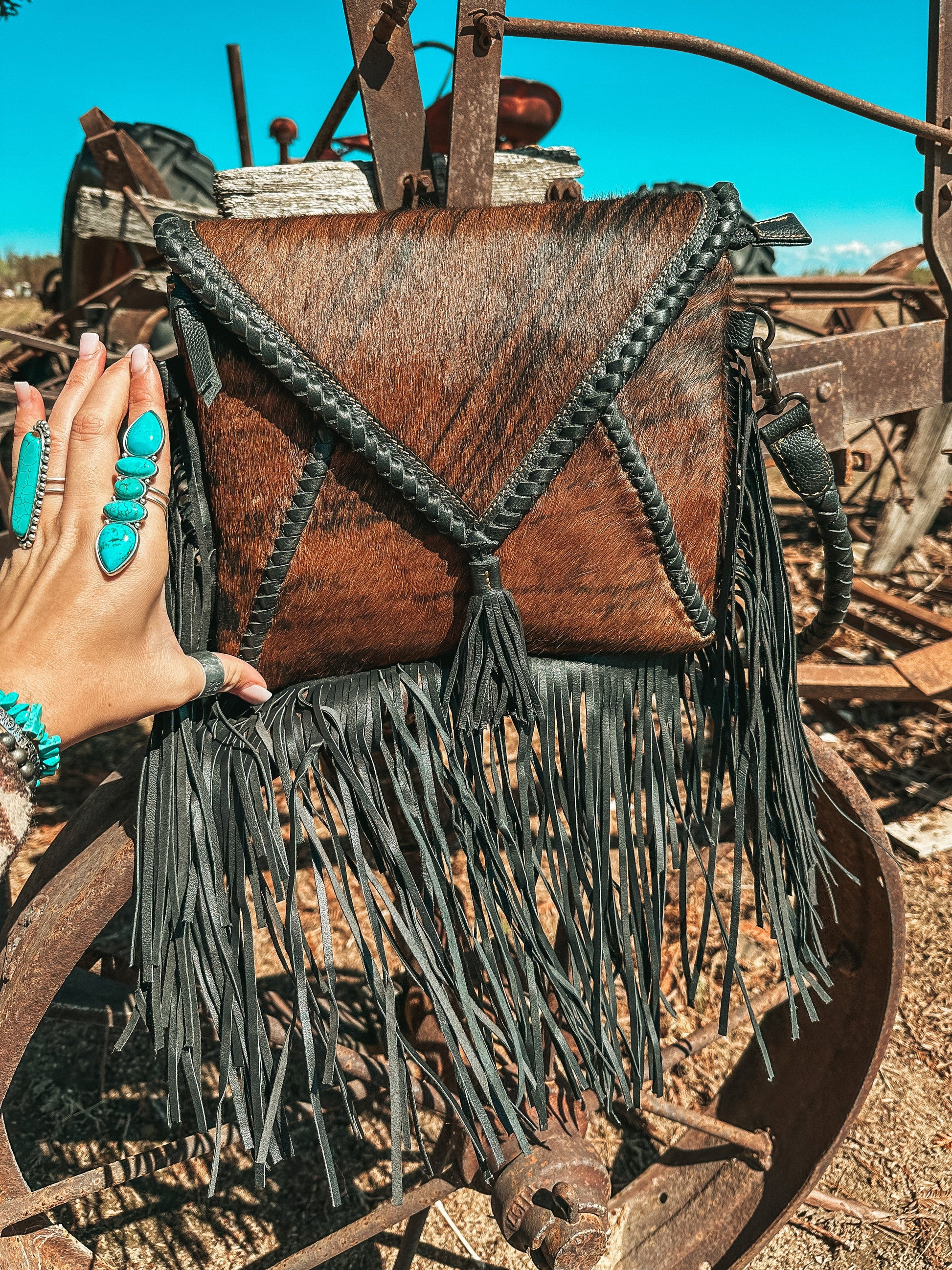 Introducing The Xia, a Haute Southern Hyde by Beth Marie Exclusive. Xia boasts hand woven fringe, beautifully accentuating it’s cowhide body. She comes with two straps!!! Switch between the 35” and the 54.25” for different uses. (Measurements are approximate Please allow for some error)