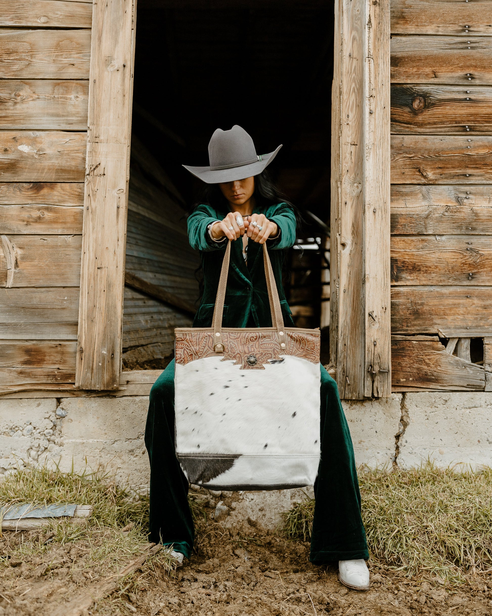 This is an all-purpose tote bag which is highlighted by hand-tooling work on the top. The rear is made from old military tent which provides long-lasting use.