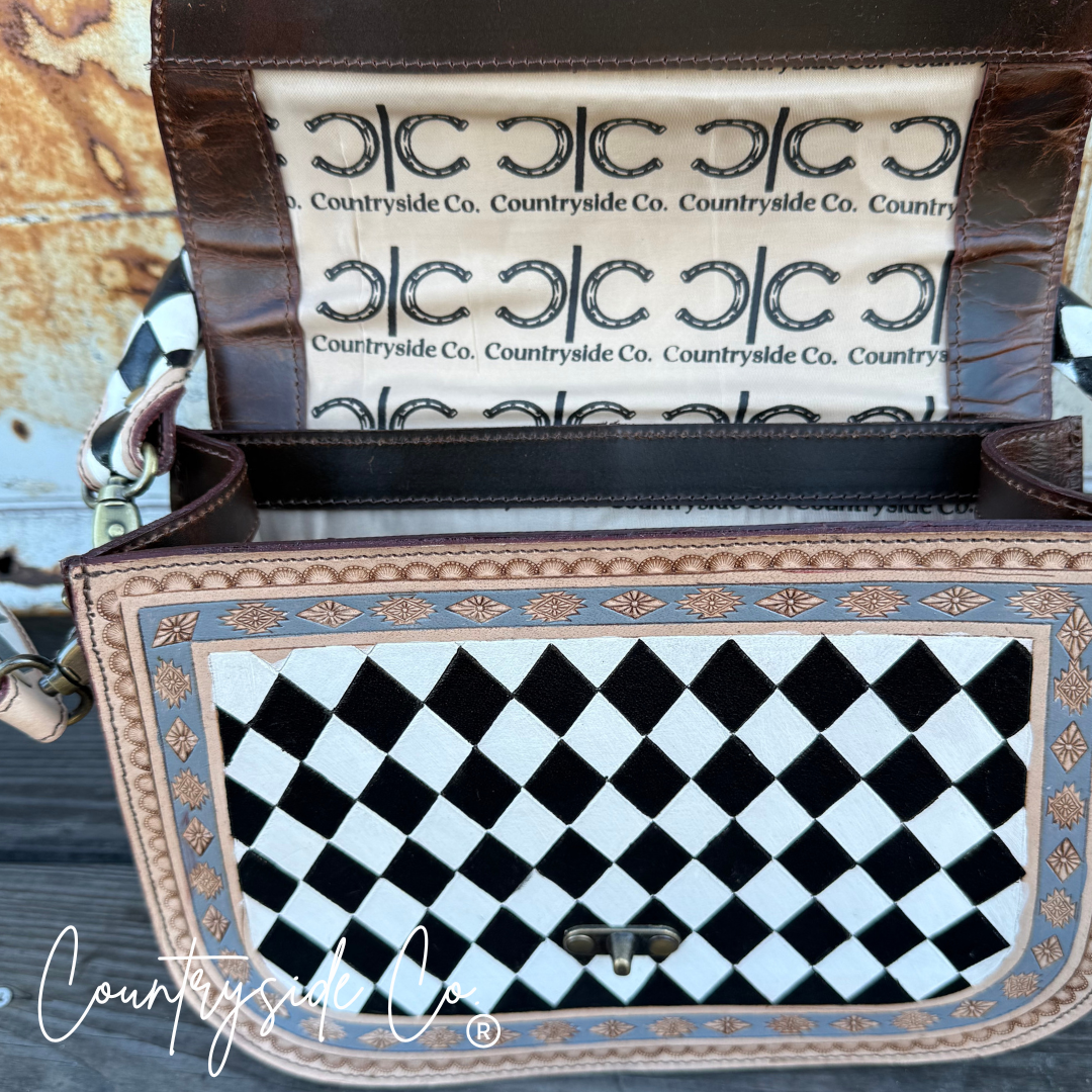 The Zadie Tooled Leather Concealed Carry Handbag presents refined functionality with artisanal details. Featuring two adjustable shoulder straps crafted from the same exquisite tooled leather as the body, this sophisticated accessory balances comfort with elegance. The distinctive antiqued latch closure adds vintage charm while ensuring security, complemented by delicate hand-painted accents that make each handbag a unique statement piece. Discreet practicality wrapped in timeless craftsmanship. These bags are hand painted so please allow for minor imperfections.